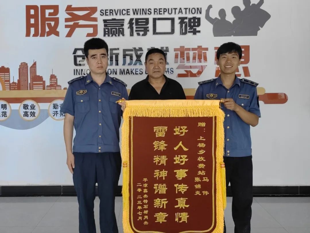 近日,市民肖先生專程驅車來到平華一級公路上楊收費站,將一面錦旗送到了馬錦炎、馬偉兩名同志的手中,錦旗上寫著“好人好事傳真情,雷鋒精神譜新章”,表達對平華一級公路上楊收費站工作人員的感謝。