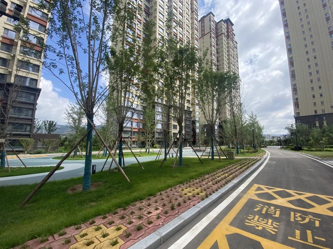 小區(qū)主入口路面采用花崗巖石材配祥云文化地雕,高低錯(cuò)落有致,如一幅畫卷徐徐展開。新中式大門高端大氣,氣勢(shì)恢宏。項(xiàng)目北側(cè)為涇河干流綜合治理項(xiàng)目兩路綠化工程,漫步于綿延不絕的綠色長廊,盡情呼吸空氣中的負(fù)氧離子,臨河水邊嬉戲,于公園中游玩。由北側(cè)入苑后印入眼簾的是一幅淡墨山水畫境,兩側(cè)以錯(cuò)落起伏的波浪草丘為山,營造出鐘靈毓秀的山川大河之景。設(shè)計(jì)巧妙的利用了消防登高場(chǎng)地透水混凝土作為活動(dòng)健身廣場(chǎng)和超級(jí)植草地坪相結(jié)合,既滿足消防要求的同時(shí)又提升了小區(qū)品質(zhì)。小區(qū)綠化率高達(dá)37.15%,喬、灌木搭配種植,高低錯(cuò)落、疏密有致、四季常綠、季季有花。開窗可見綠,出門可踏青,環(huán)境宜人。
