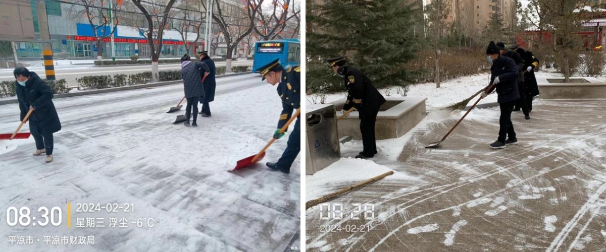 2月21日清晨,平?jīng)鲑e館全體職工就立刻奔赴各自負(fù)責(zé)的“戰(zhàn)場”,開展掃雪工作。大家不畏寒冷,拿起鐵鍬、掃帚等除雪工具,迅速開展清雪活動(dòng),及時(shí)消除道路安全隱患,為客人出行保駕護(hù)航。