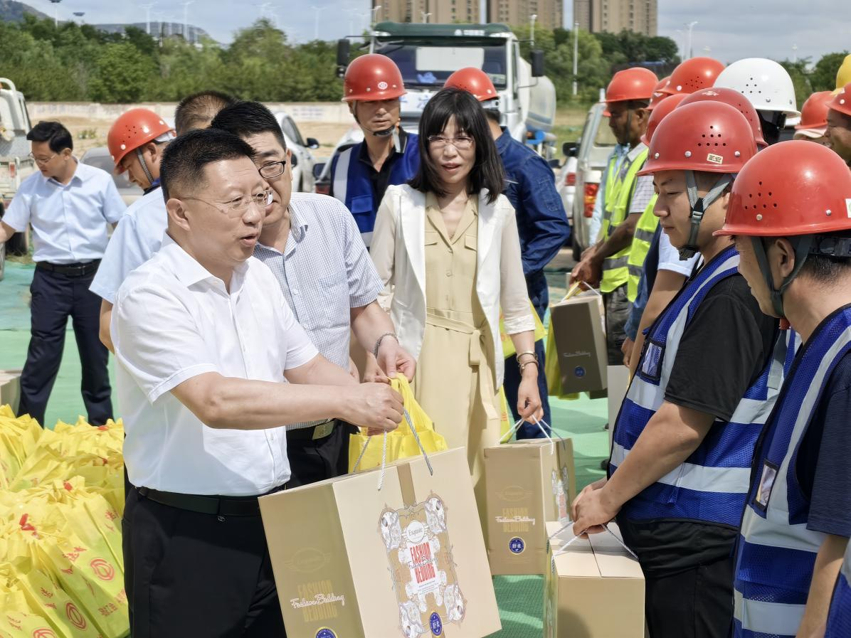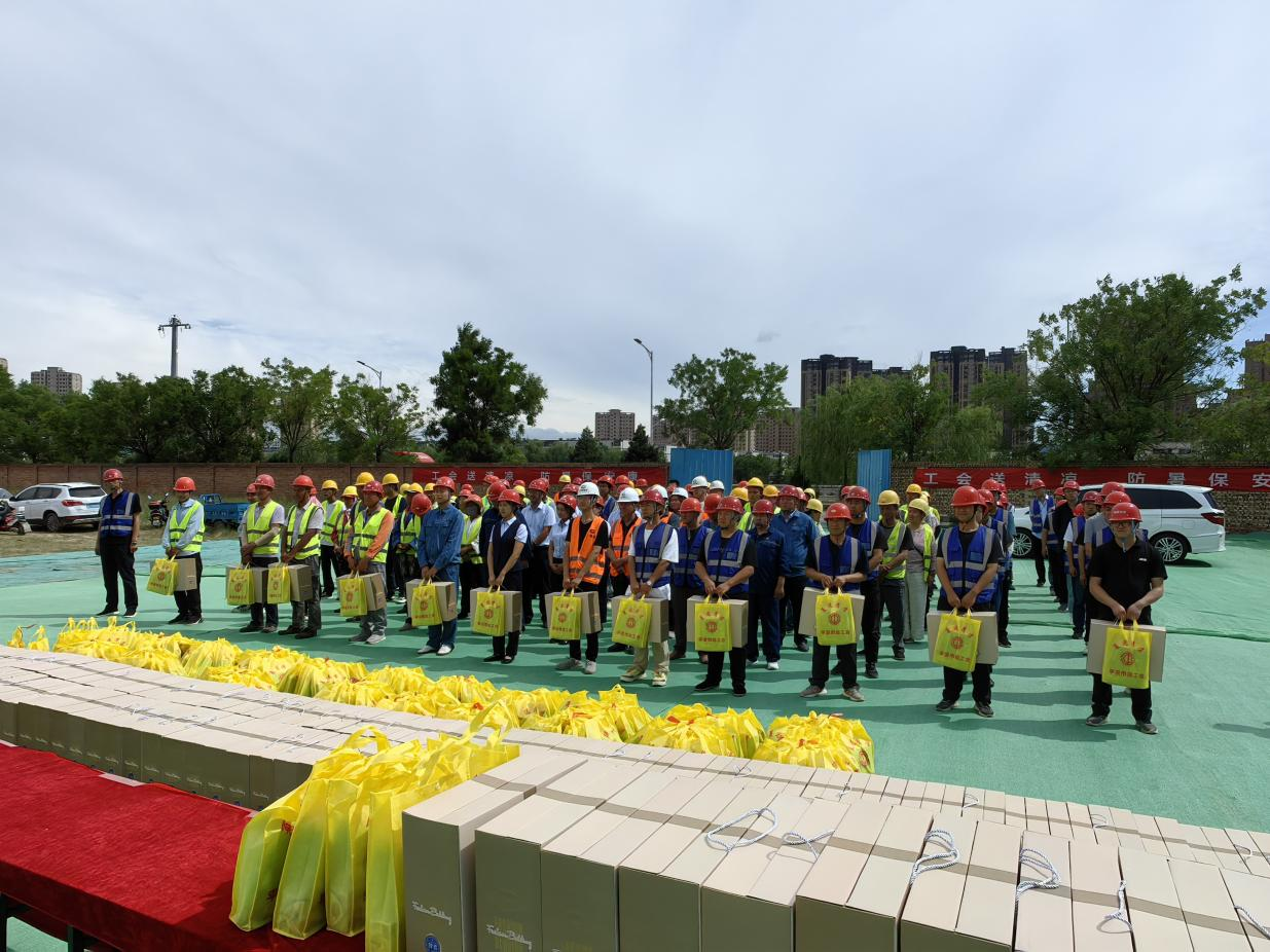 慰問(wèn)現(xiàn)場(chǎng),慰問(wèn)組對(duì)炎炎夏日辛勤奮戰(zhàn)在建設(shè)一線的工友們表示了親切的關(guān)懷,叮囑大家要增強(qiáng)自我保護(hù)意識(shí),注意防暑降溫。隨后,為一線建設(shè)者送上夏涼被、茶葉、花露水等防暑降溫物品。