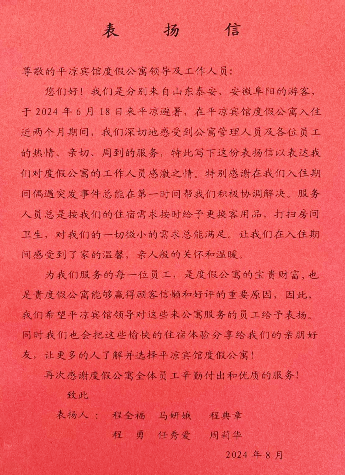 近日,平?jīng)鲑e館收到了一封來(lái)自入住度假公寓賓客的表?yè)P(yáng)信,字里行間表達(dá)了對(duì)平?jīng)鲑e館真情服務(wù)的肯定和感謝。