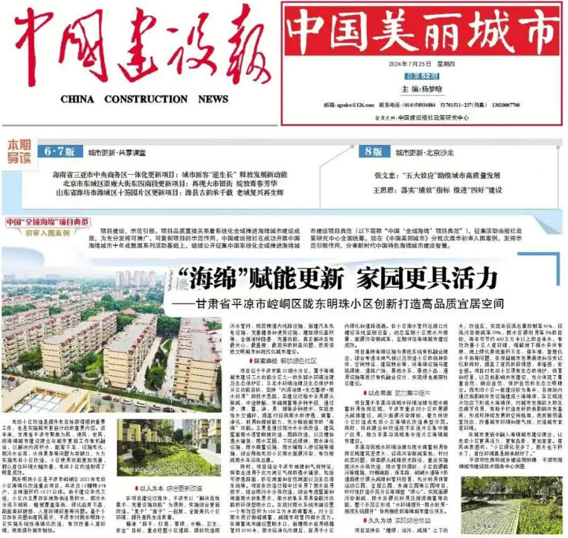 日前,經(jīng)來(lái)自中國(guó)科學(xué)院、住建部科學(xué)技術(shù)委員會(huì)、中國(guó)城市規(guī)劃設(shè)計(jì)研究院、北京大學(xué)、清華大學(xué)等單位的15位權(quán)威專家審核,綜合網(wǎng)絡(luò)投票情況產(chǎn)生了2024年度“中國(guó)‘全域海綿’項(xiàng)目典范”首批終審入圍案例。城建投公司施工的隴東明珠小區(qū)老舊小區(qū)改造項(xiàng)目、平?jīng)鍪械谝恢袑W(xué)海綿化改造工程、永順花園海綿化改造工程等3個(gè)項(xiàng)目成功入圍,并先后在《中國(guó)建設(shè)報(bào)·中國(guó)美麗城市》刊登介紹。