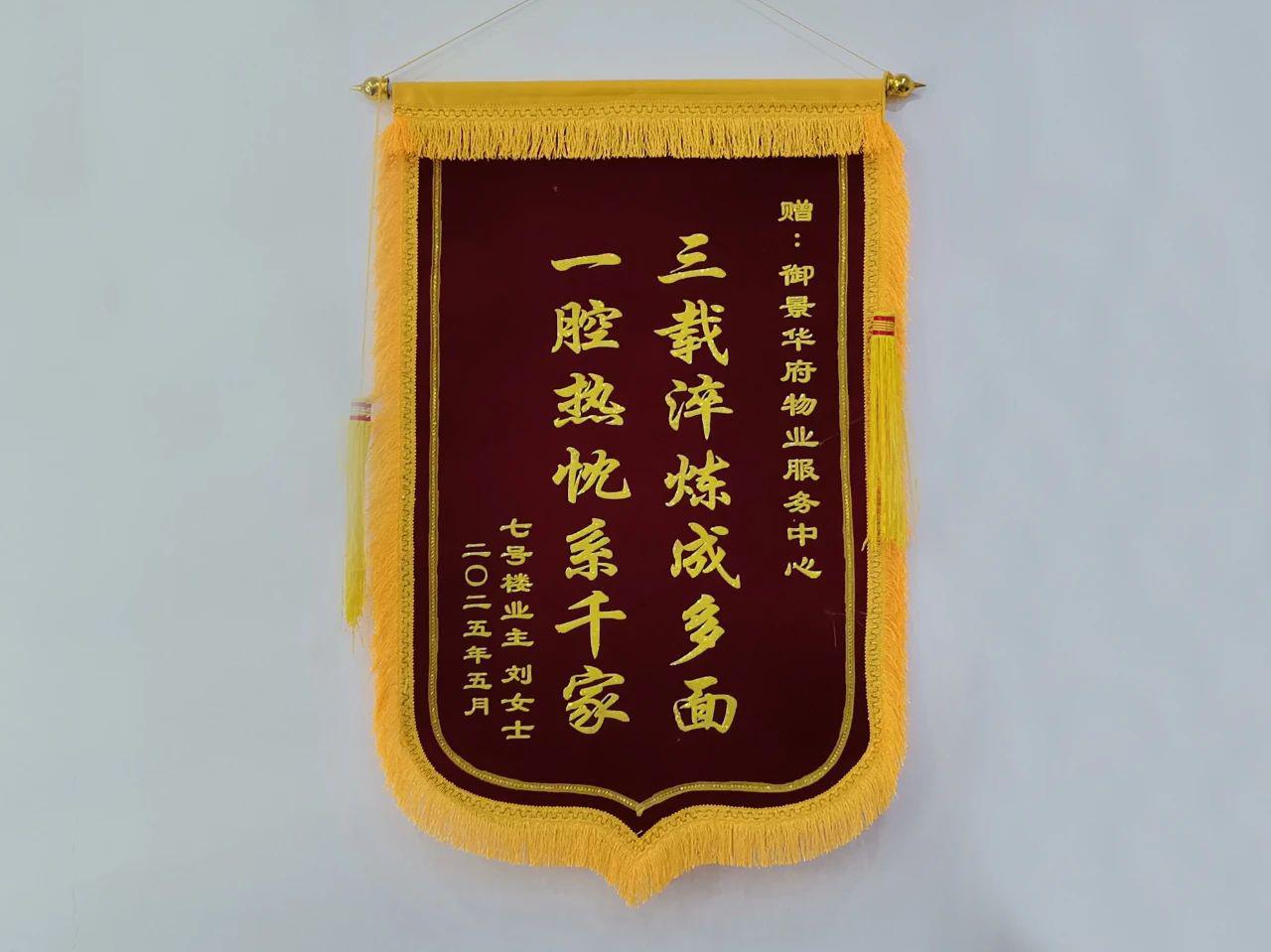 5月26日,御景華府小區(qū)業(yè)主劉女士向物業(yè)服務(wù)中心贈(zèng)送了一面繡有“三載淬煉成多面,一腔熱忱系千家”的錦旗,并附上一封感謝信。