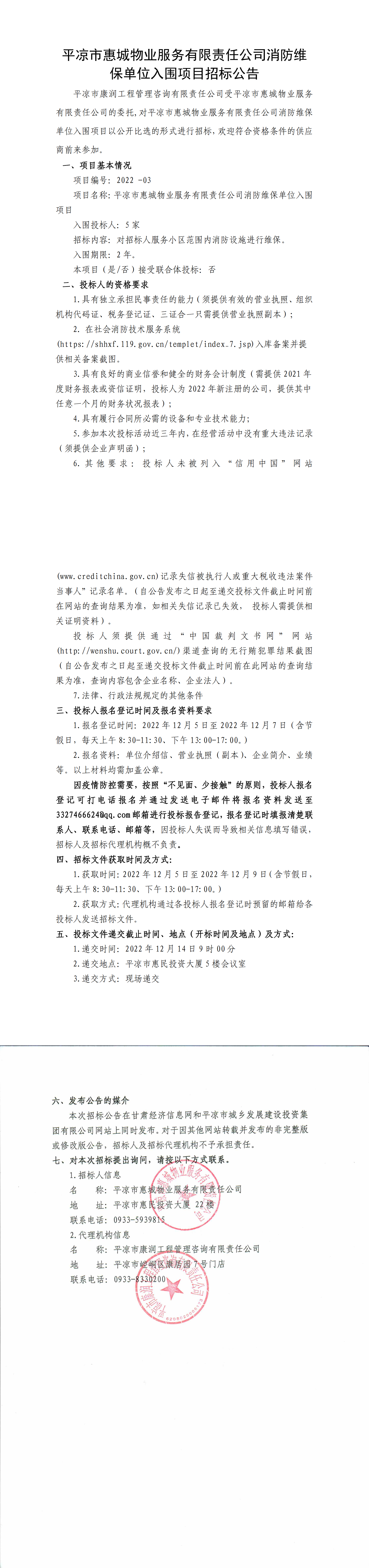 平?jīng)鍪谢莩俏飿I(yè)服務(wù)有限責(zé)任公司消防維保單位入圍項目招標公告
