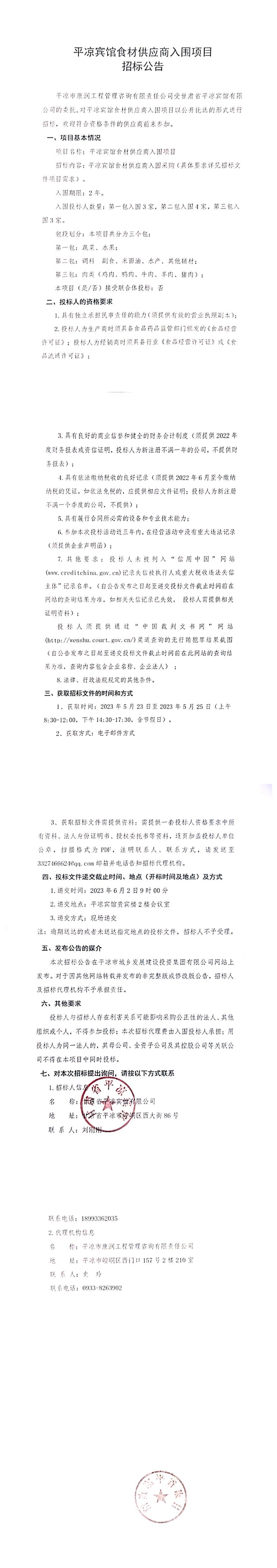 平?jīng)鲑e館食材供應(yīng)商入圍項目招標(biāo)公告